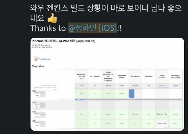 개선으로 인해 가져온 효과는 ("코드화" == "히스트로 체크 가능한 형태") + 빌드 진행도의 가시성 확보가 부가적으로 있었습니다.